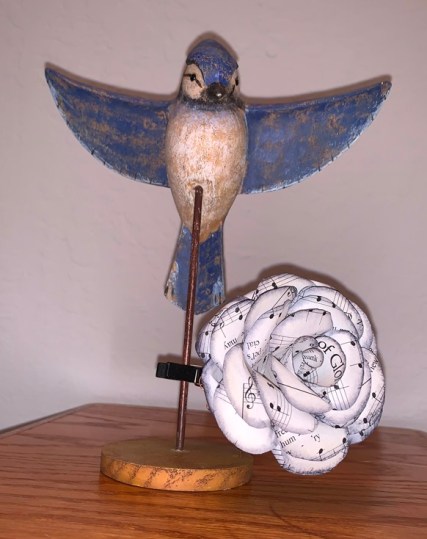 Posted in Friday Photo | Tagged: blue bird, book flower, Friday Photo, paper flower, wooden bird | Leave a Comment »