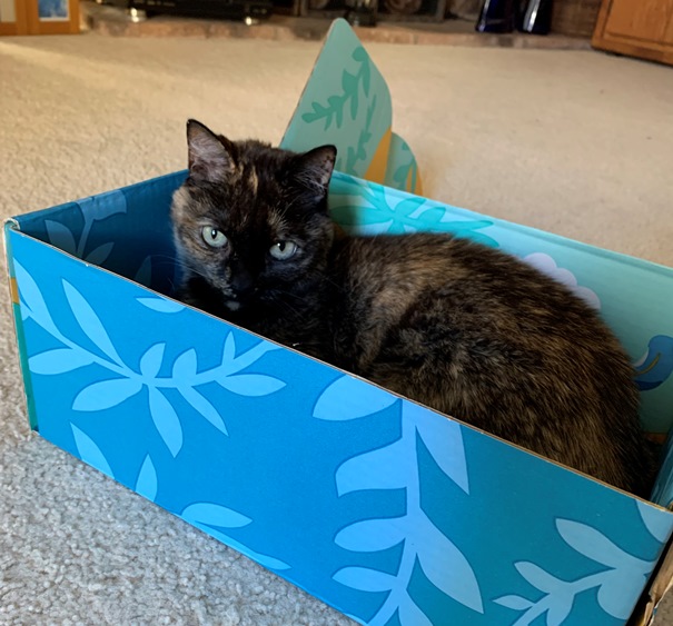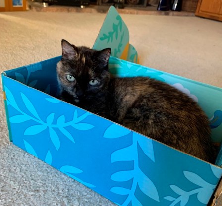 Usually this box is closed because I use it to give height to my laptop, but the second I opened it, this one stepped inside. Then she got comfortable. It is so funny to me that no matter how many boxes they have they are always happy with one more. Nessa in the FitFabFun Box for today’s Friday Photo.