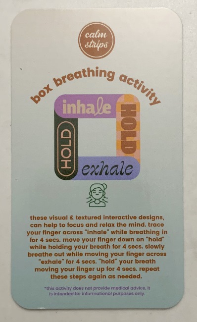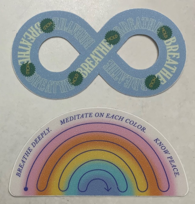 A couple of years ago I saw a product I thought was cute so I ordered some for my students. They are called Calm Strips. I ordered one for box breathing, one that is an infinity loop, and one that is a rainbow. The idea is to use your finger to slide along the strip, giving you something physical to assist with the breathing and perhaps help to remind you of the inhale, hold, exhale.