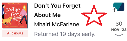 Don’t You Forget About Me (Mhairi McFarlane) – loved it. Bought it. Have listened to it again. Typical make-you-smile rom-com. I love Mhairi McFarlane. This book contains one of my favorite lines ever. I tweeted about it and Mhairi replied. *Rom-com*