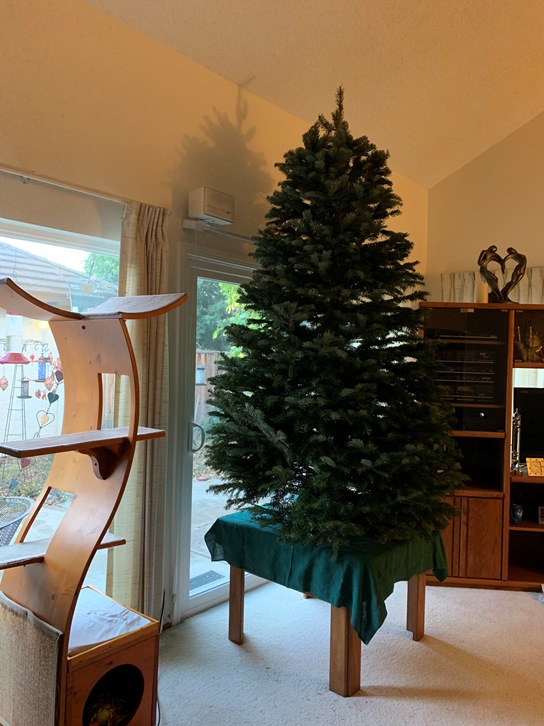 We put it in a different place this year. Just a couple of feet over, but I was thinking the cats would like it better if they didn’t get kicked out of their spot. We normally move their tower. I was also thinking they would appreciate not having to give up the best sun . . . but this whole month has been kind of gray without a lot of sun during their normal sunning hours.