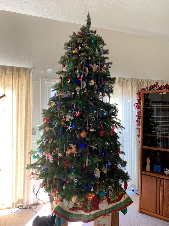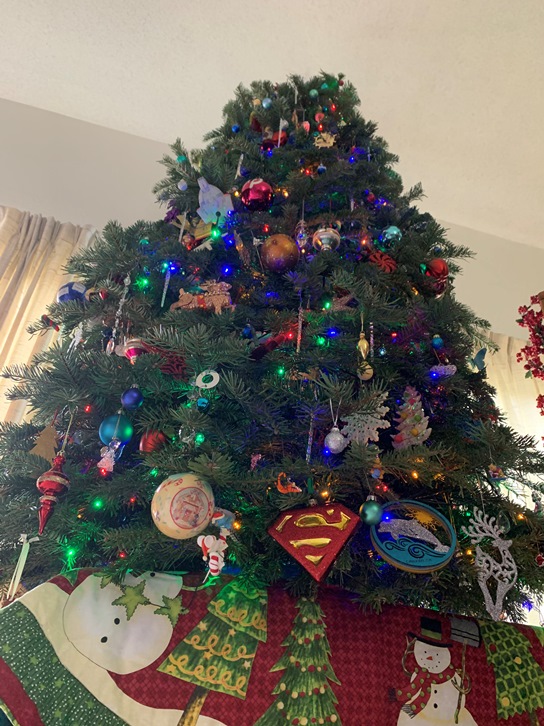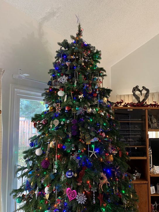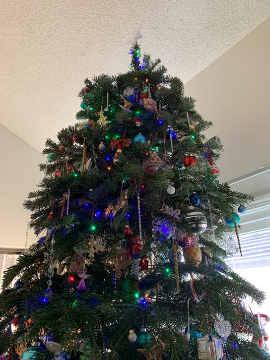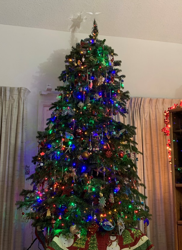 Here we are, the seventh day of the 12 Days of Christmas. And it is New Year’s Eve. It is going to be 2025 tomorrow. Wow. Here is another picture of our Christmas Tree. The star topper is just plain, but it tends to catch the light and make lovely reflections on the wall. I bought a new one this year (a metal gold star) so this may be the last year for this plastic one. We will see. But this is a delightful shot of it.