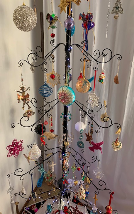 It took me a particularly long time to assemble this year as I had thought I had mislabeled the parts, but I had not. Then I didn’t open every box (containing ornaments) that I have and start pulling things out. I was trying to do a few boxes at a time which meant different ornaments were going on the tree. I try to use the heavier ones on the metal tree, but I also like to use ones that look good from the back.