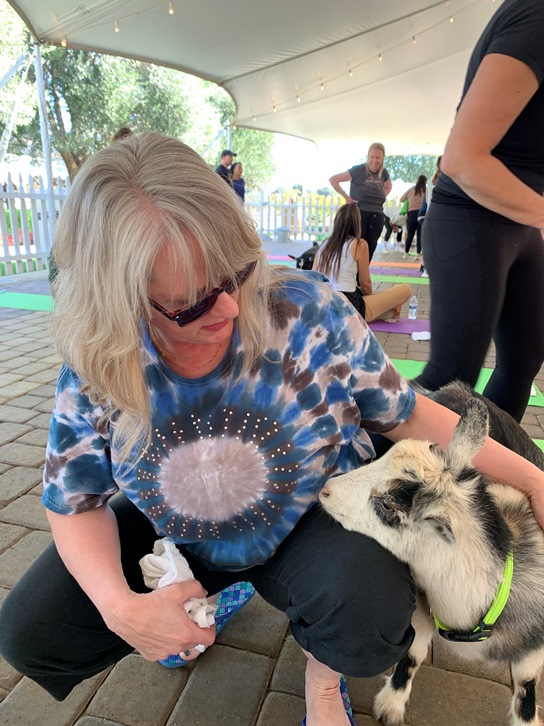As a note when one goes to do yoga with animals it is really about the experience of the animals and not so much the yoga. But while I was there I was still trying to do some asana. The helpers walk around and place food on everyone’s mats so that the goats move around and interact with everyone. And there may have been one helper per three people and they were very good at taking care of any goat incident right away. They would sweep up the pellets and get a new mat if needed.