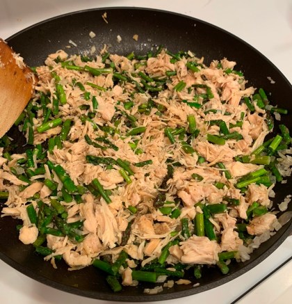 Put the drained chicken in the pan with the onion and asparagus. Sprinkle chicken with garlic salt and Worcestershire sauce. The chicken is cooked, it only needs to be heated, but cook the asparagus to your liking.