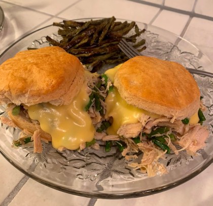 OH! And the leftovers! I put the bottom half of the biscuits in an oven proof dish, then pilled the chicken mixture on top, topped it with the cheese and put it in the oven (350°) for about 30 minutes, I put the tops of the biscuits on foil and heated them for about 10 minutes. Then put it on plates to serve. Delicious!