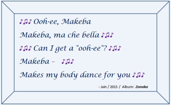 “Makeba, Makeba, me que bella. Can I get a “ooh-ee”?” . . . . yeah, that is what it says I had to look it up because I have this tune on repeat in my head and I had no idea what it was. Some sites say “me que bella” and some sites say “me che bella”. The singer-songwriter is French.
