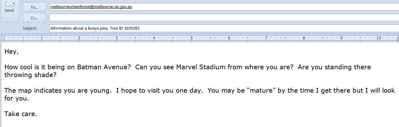 But I am at the point where it mentions you can e-mail trees in Melbourne. Now the program started years ago with the intent of notifying the city if there was an issue, but people emailed gratitude and admiration. So . . . . of course, I had to do it.