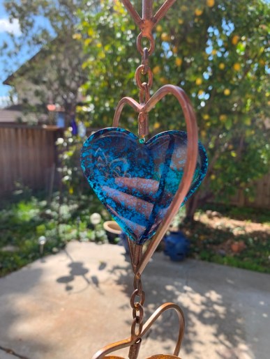 I have always wanted a rain chain.  They are so cool, but you have to remove your drain/gutter.  And in order for them to actually be “cool” you have to be able to see them.  They are cool and beautiful and if you are not able to see them then they are not as fun.  This one is PERFECT!  It is shiny!  It is multicolored!  It is hearts!  But for us to use it like it is supposed to be used it would be in a spot we would never see.  So for now it is just hanging outside the window not doing a portion of it’s job (being a rain gutter) but being beautiful and something we look out that makes us smile – that is the bigger part of its job anyway.