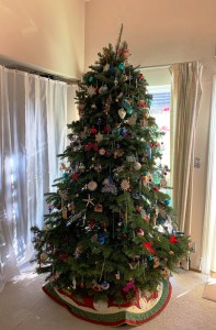 This is a pretty narrow tree. Since I use the room as my studio to do my Zoom classes it works. Gentle yoga and stretch don’t require a lot of room, but Nia has lateral movement so I am going left and right a lot. It is easier not to be too restricted. So a narrow tree is working ok. I was just kinda surprised when I saw it in the daylight today. It is a good tree. Looking at another photo of it though, I think it may have shrank!