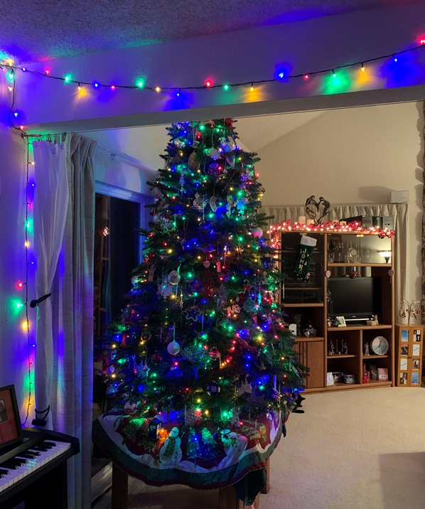 With our living room as my studio for Nia, yoga, and stretch I’ve had to make some adjustments that have displaced some of my Christmas decorations. I’ve had to move some furniture around and my Zoom backdrop is in the way of a table that I normally put up to display a number of Christmas decorations. So . . . I’ve been rearranging things a bit. I just put the small bottle light up tonight, and I thought that it would be the piece that allowed me to be at peace with this arrangement, but I am not sure about it yet. I will have to sit with it. I have still been up and down (there are two ladders involved) decorating so we will see once I have a chance to actually observe it. My original vision was for multi-colored strings of lights. I didn’t have them, but might be able to scrounge them up. Maybe THAT will do the trick.