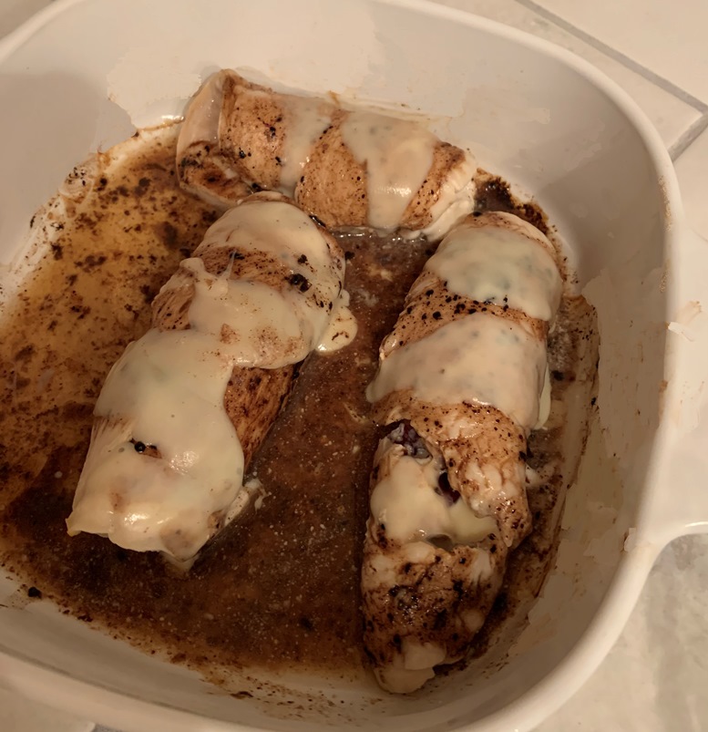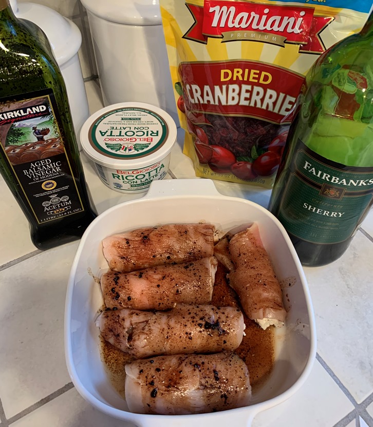 Lay the turkey breasts out sprinkle them with salt and a little pepper. Put about a tablespoon of ricotta on one end and then sprinkle with cranberries. Roll up each breast and place in a baking dish. Sprinkle with sherry and balsamic vinegar. Add another sprinkle of salt. Place in the oven. After about 15 minutes take the dish out and put some mozzarella on top of each roll. Then put back in the oven for about 15 minutes.